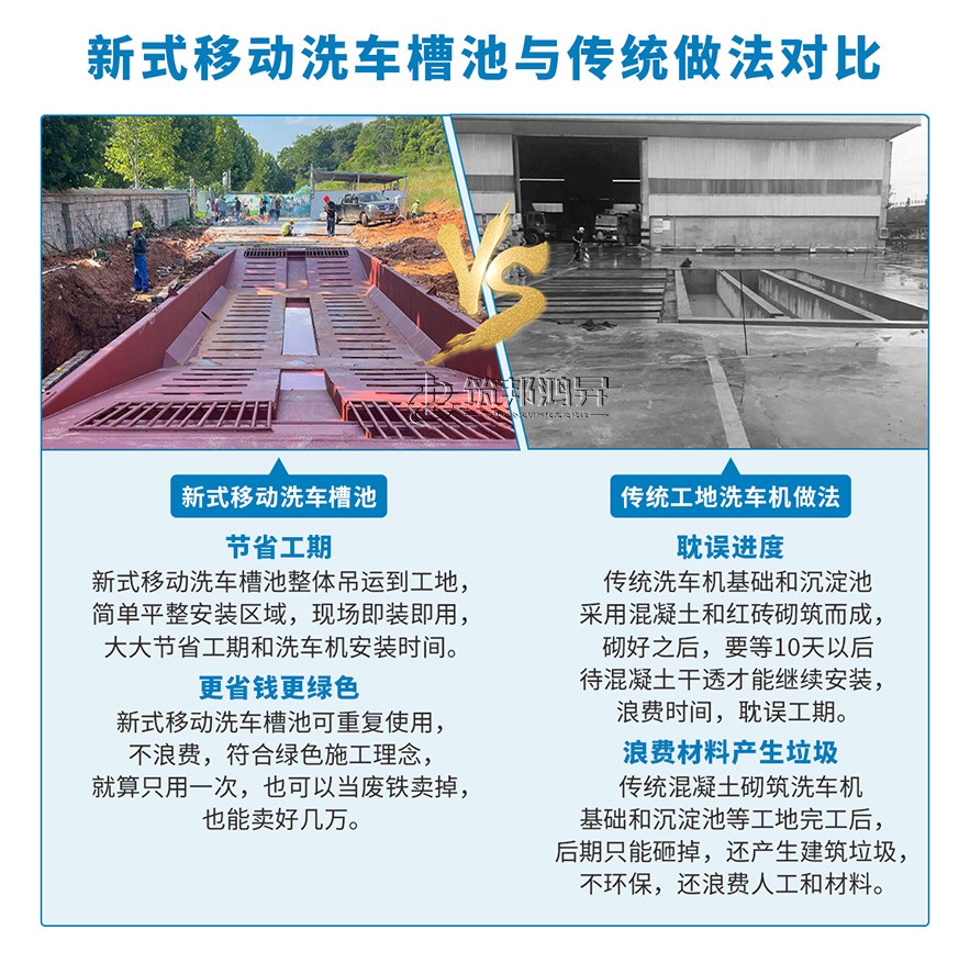 筑邦鴻昇研發(fā)鋼結構洗車槽池采用整體設計,整體吊運,用料厚實。替代了之前的工地洗車機下面的水泥基礎,更加牢固方便,節(jié)省了大量的基礎砌筑人工和材料,還可以重復使用。如果不需要重復使用;十幾噸重的洗車槽做廢鐵賣,也能賣好幾萬,大大節(jié)省了施工時間和成本。鋼結構洗車槽池常規(guī)款式有16.6米長和13米長,尺寸可以定制。