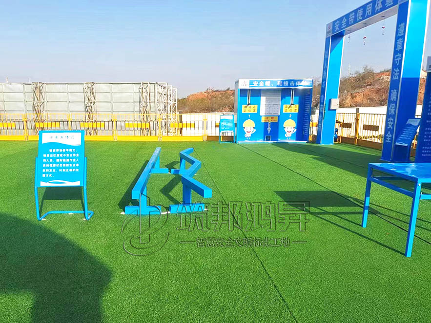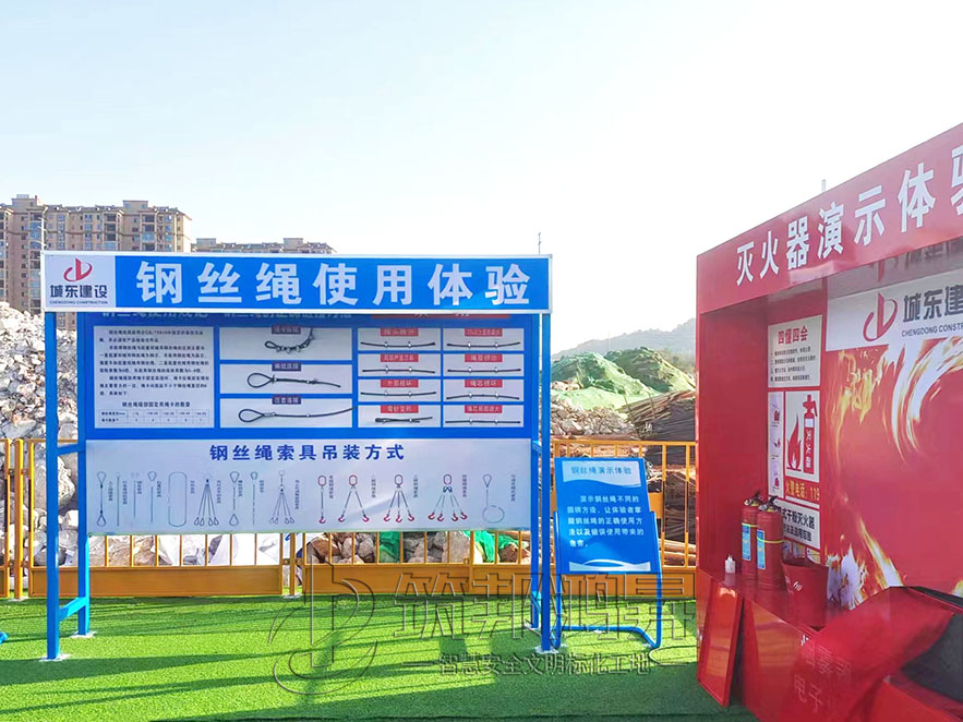 此次合作的安全教育培訓體驗區設備包括了安全鞋/帽撞擊體驗,安全帶使用體驗、安全防護用品展示體驗、綜合用電演示體驗、鋼絲繩使用體驗、班前講評臺,平衡木體驗、滅火器演示體驗等。另還有工地茶水亭等標化產品。