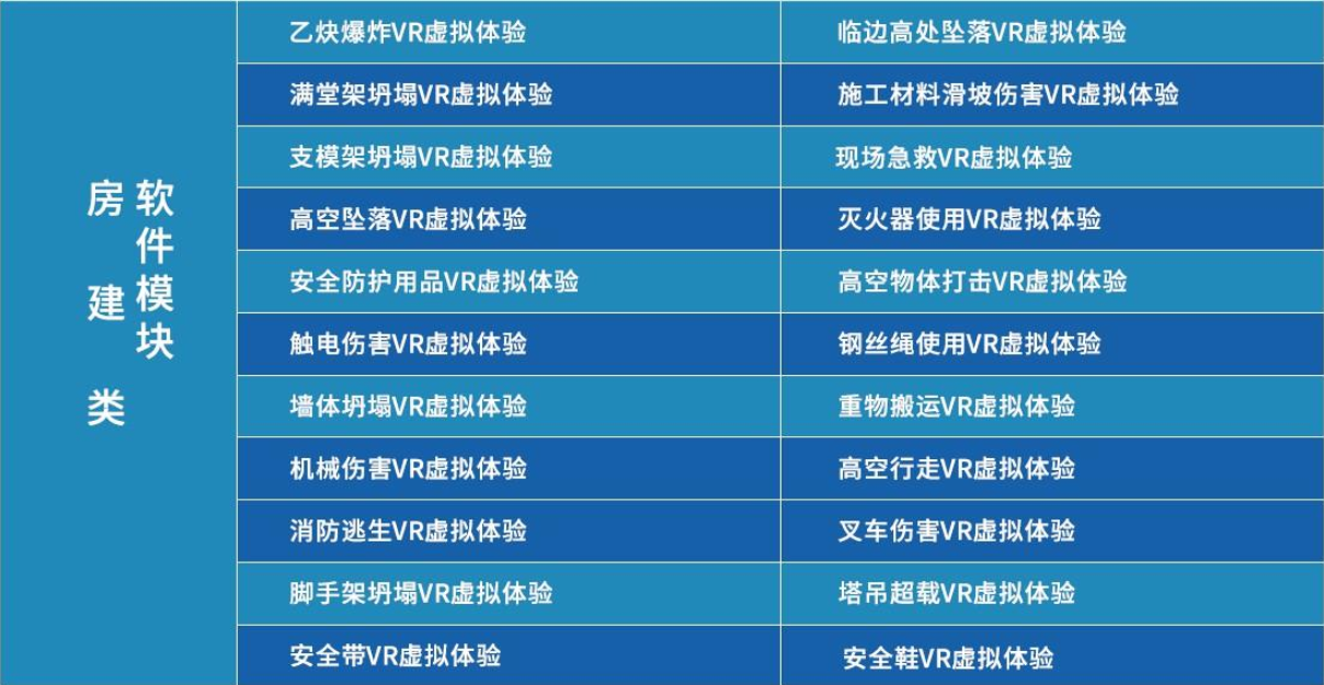 VR安全體驗館的體驗項目包括了房建、地鐵、路橋等多個模塊的內容,具體如下: